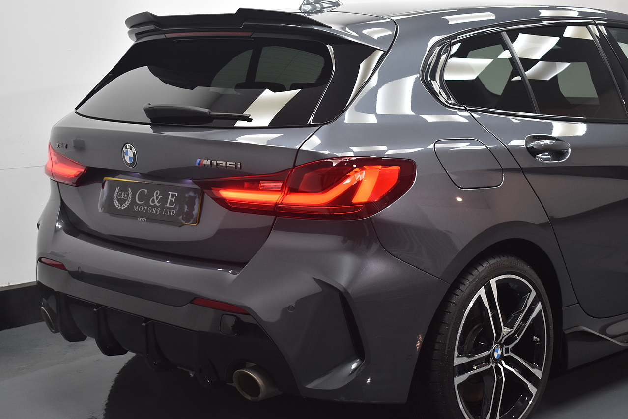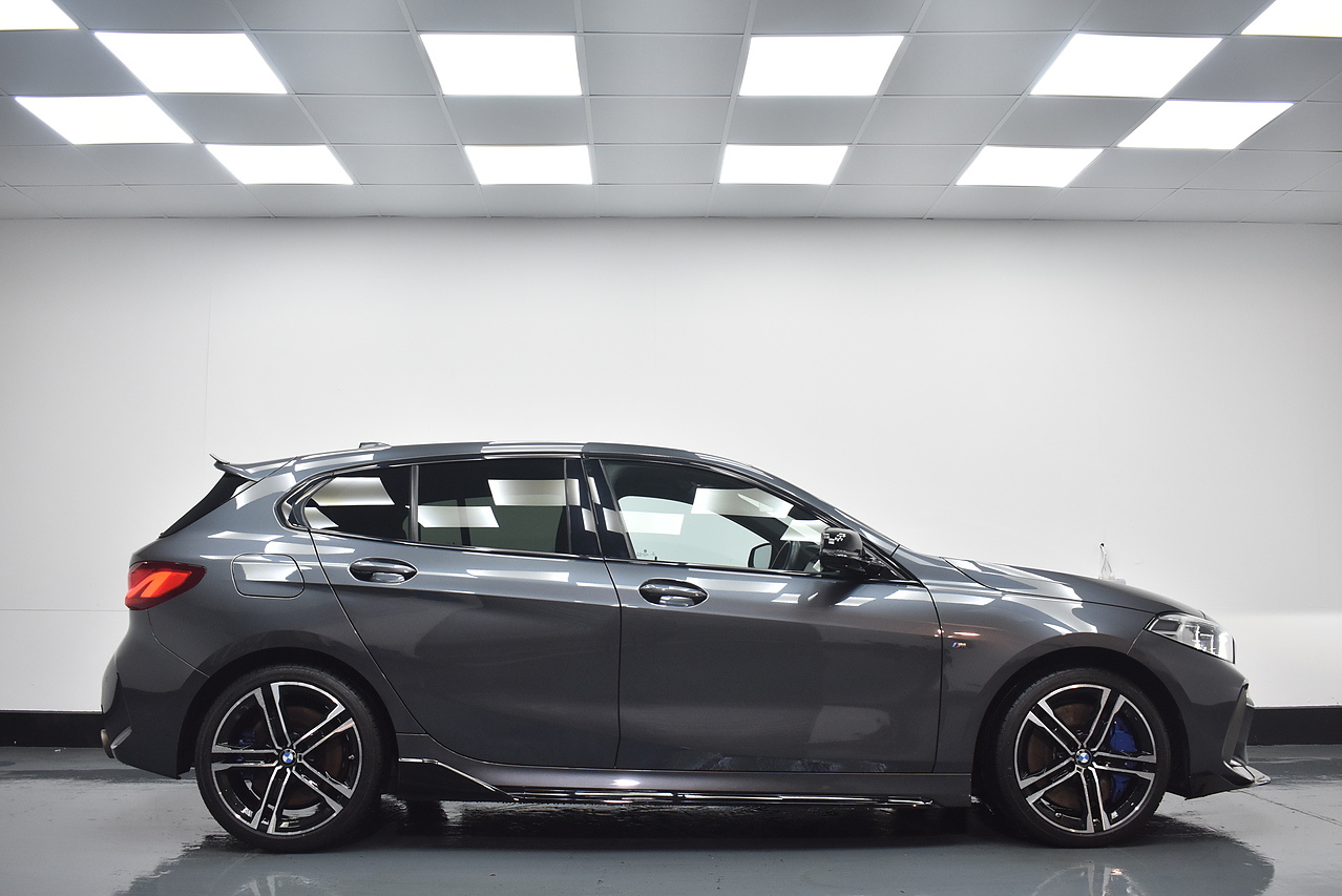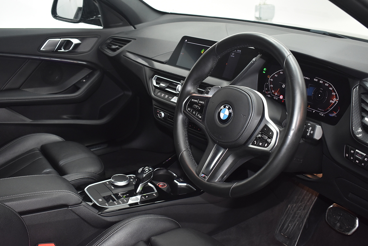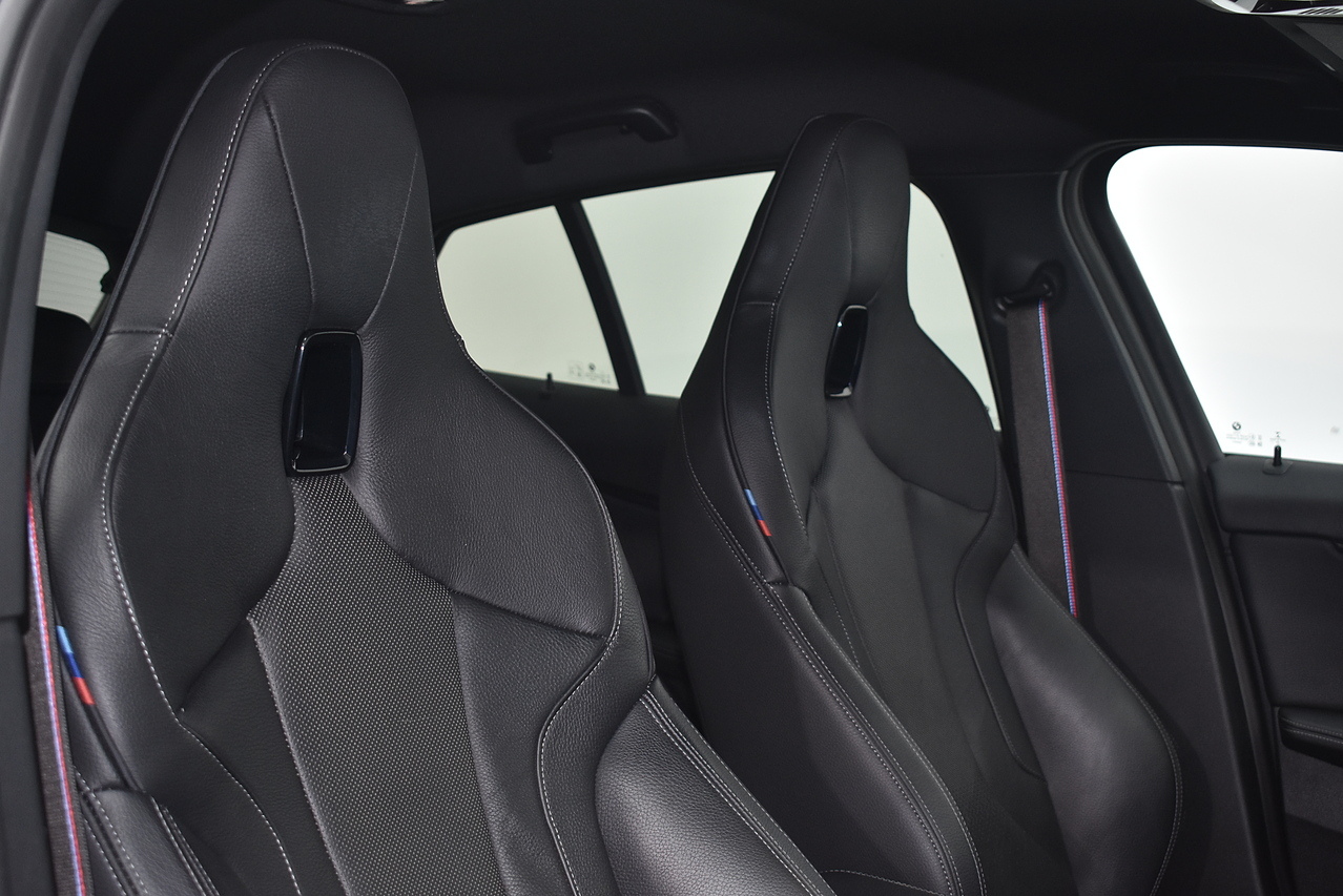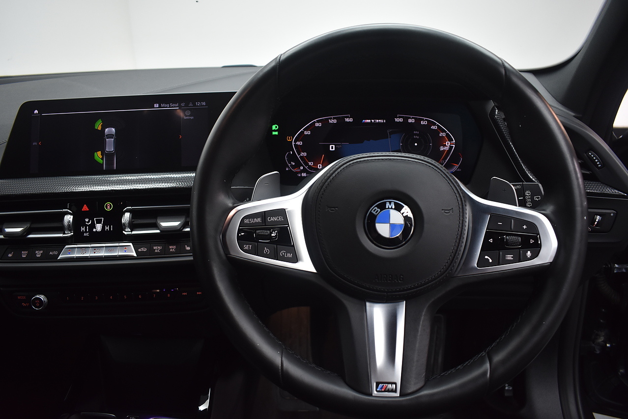 This 2021 BMW 1 Series M135i boasts an MOT valid until August 2026, offering excellent peace of mind. This Euro 6 compliant 2.0 litre petrol model features a four wheel drive drivetrain and has a partial service history, with its last service completed on 24 July 2025 at 31968 miles. Inside, you will find perforated Dakota leather upholstery in black with grey highlights, heated seats for the driver and front passenger, and Bluetooth connectivity for audio streaming. For convenience, it includes cruise control with brake function and speed limiter, as well as front and rear park distance control.